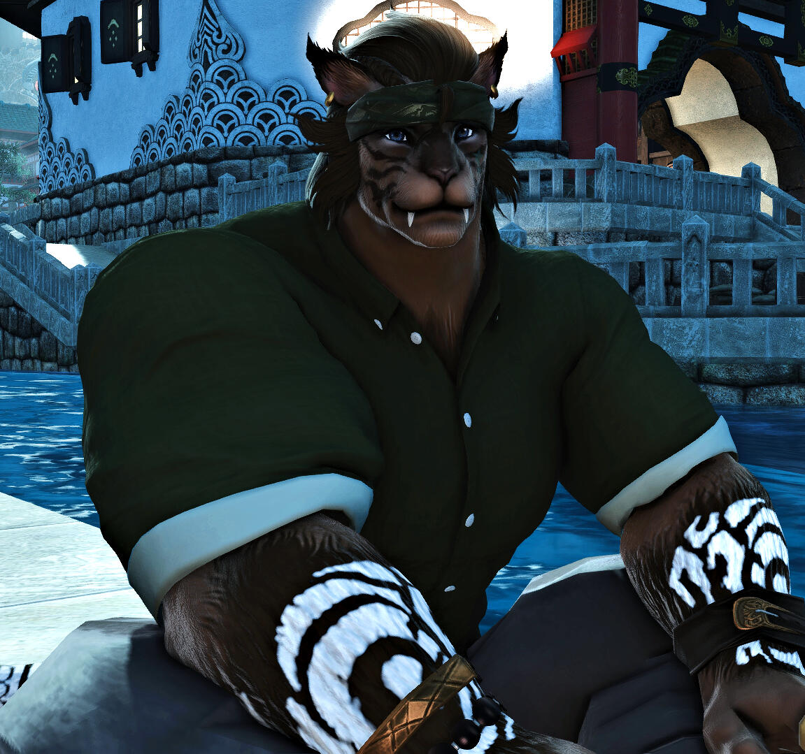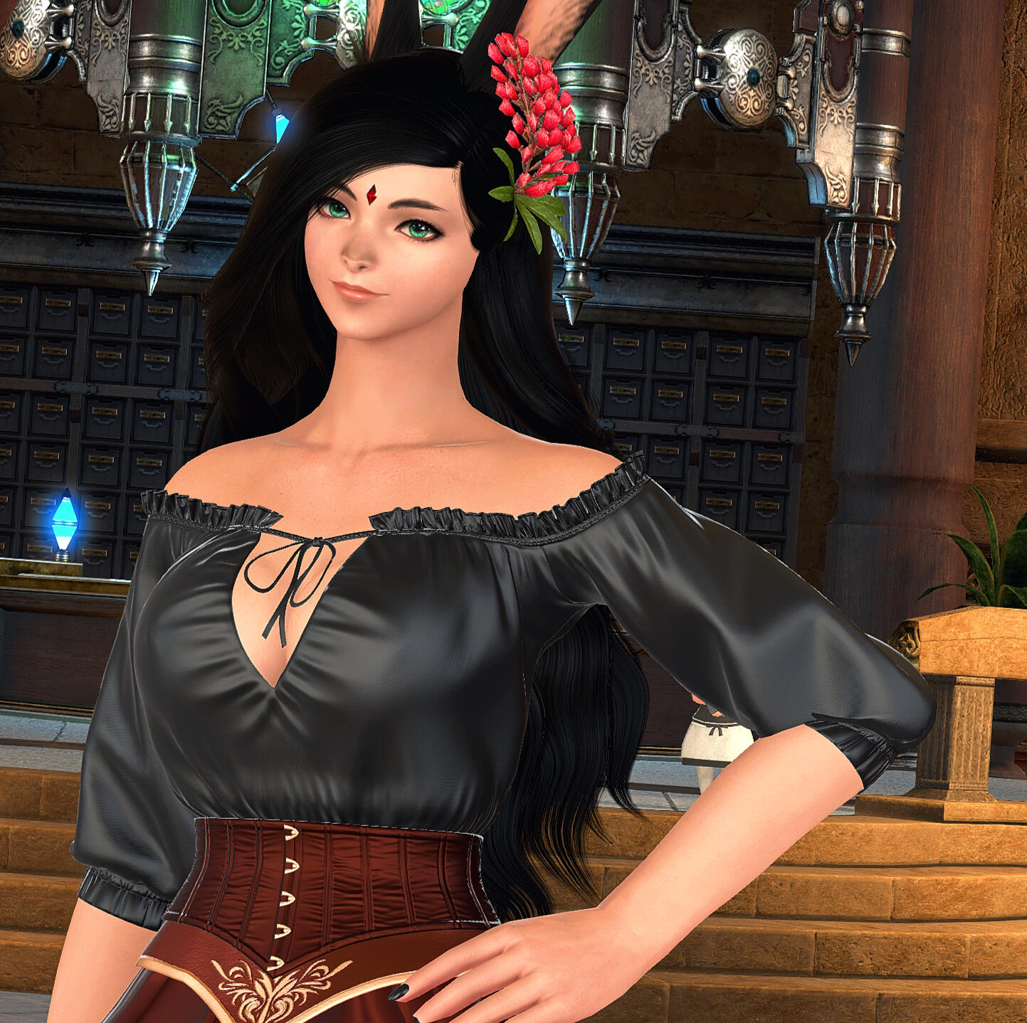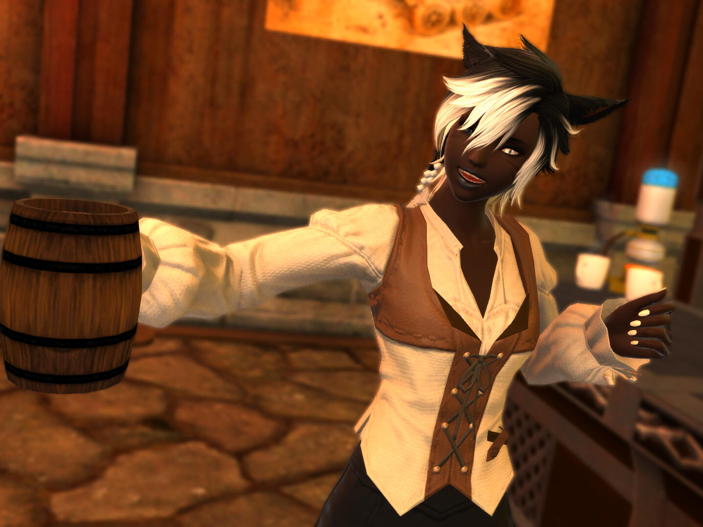 Domino is her name, and gambling is her game... Or at least, it used to be. A former Gold Saucer waitress, this spunky Miqo'te came across the group by happenstance one night and now she doesn't seem to want to leave. With her outgoing personality and good company, she quickly found a home for herself amongst the shop's roster alongside her sister, Minh, and now works as the barkeep. Though if it's because she's most familiar with handling drinks, or uses it as an excuse to try the stock on the job, nobody's really quite sure...
